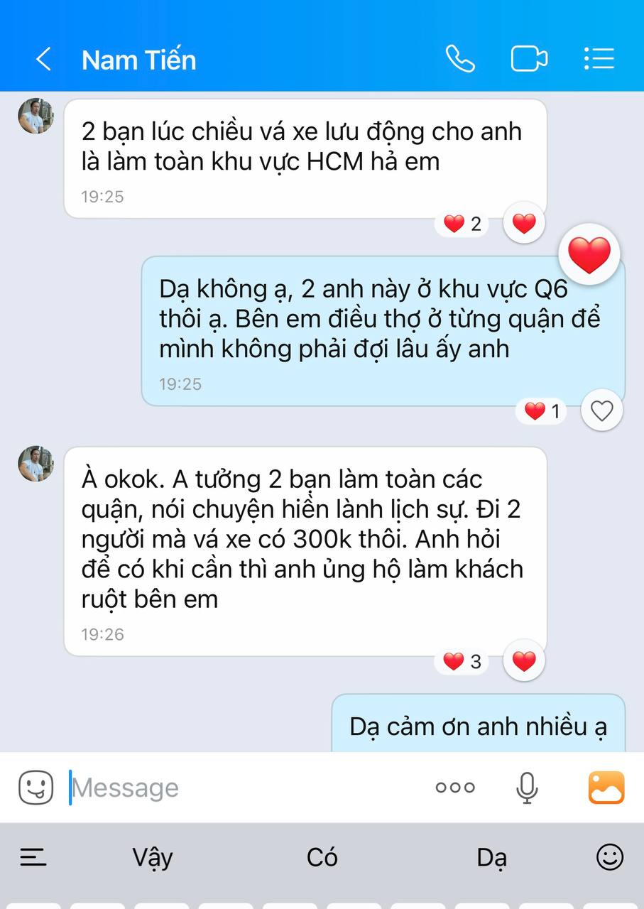 Báo giá công khai trước khi làm, minh bạch giá cả, không vẽ vời hay phát sinh nếu không cần thiết. Giá cố định khi vá lốp ô tô lưu động là 300.000đ/lỗ (Đã bao gồm chi phí di chuyển, không phát sinh thêm chi phí nào khác nữa)