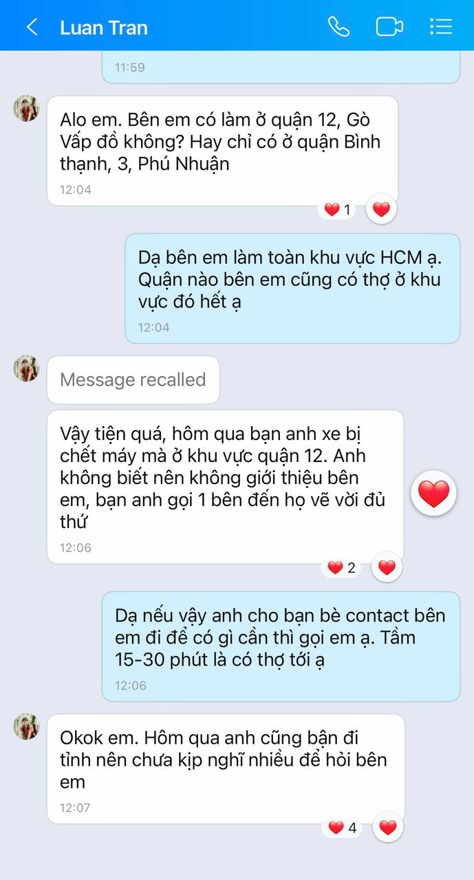- Trung tâm điều phối liên hệ thợ gần nhất (trong bán kính 3–5 km).
